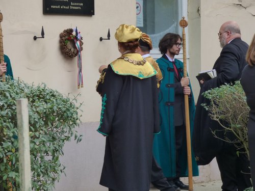 A nevek ismertetése után az emlékezők elhelyezték koszorúikat a Calvin J. Teológiai Akadémia, egykor a lelkészképesítésnek helyet adó épület falán.