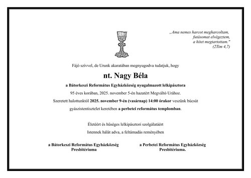2025. november 05., szerdaFájó szívvel, de Urunk akaratában megnyugodva tudatjuk, hogy Nagy Béla, a Bátorkeszi Református Egyházközség nyugalmazott lelkipásztora 95 éves korában, 2025. november 5-én hazatért Megváltó Urához. Szeretett halottunktól november 9-én, vasárnap 14.00 órakor veszünk búcsút gyászistentisztelet keretében a perbetei református templomban.
