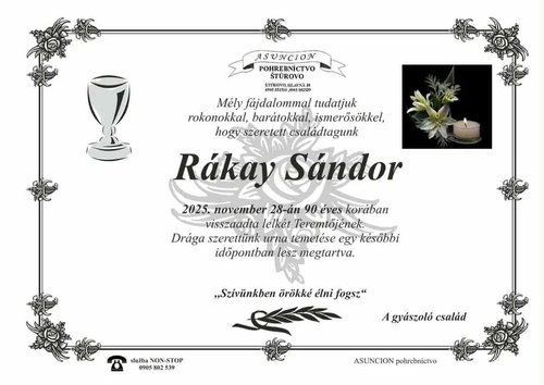 2025. december 02., keddSzomorú szívvel, de Krisztusba vetett reménységgel értesítjük a kedves Testvéreket, hogy 2025. november 28-án 90 éves korában visszaadta lelkét Teremtőjének Rákay Sándor nyugalmazott lelkipásztor. Temetéséről a család később rendelkezik.